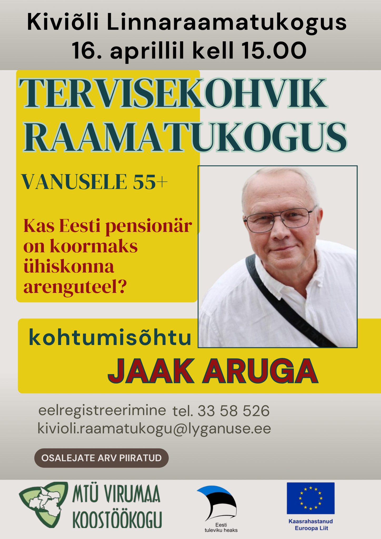 16. aprillil ootame raamatukogusse tervisekohvikute sarja järgmist külalist. Tuletame ühtlasi meelde, et kõik, kes on ennast üritusele registreerinud, võtke meiega ühendust juhul, kui teie plaanid on muutunud või muutuvad ja te ei saa üritusest osa võtta. Anname võimaluse neile, kes ootejärjekorras.